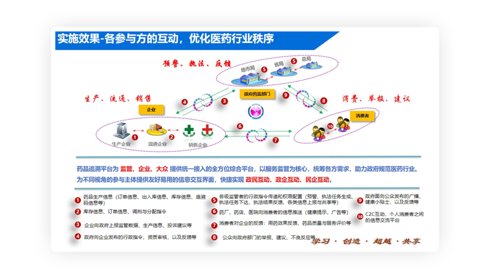 建设一物一码全品种全过程信息化追溯体系,形成全国上下统一的药品安全数据中心;快捷实现政民互动、政企互动、民企互动;提供贴合场景的金融服务,形成药品领域的全生态战略部署。